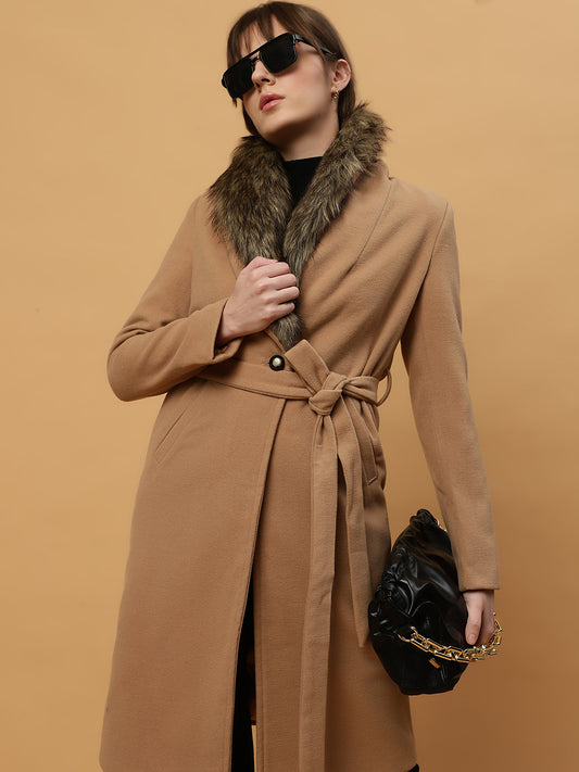 Beatnik Belted Wool Blend Coat with Faux Fur Collar Sandy Brown Blazer