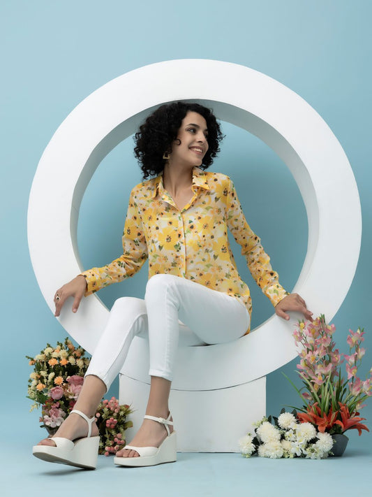 Beatnik Yellow Collar Georgette Womens Western Shirt