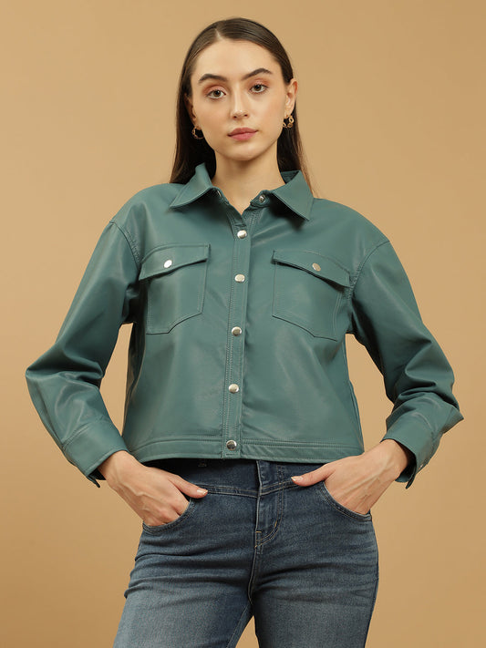 Beatnik Leather Regular Solid Womens Teal Blue Jackets