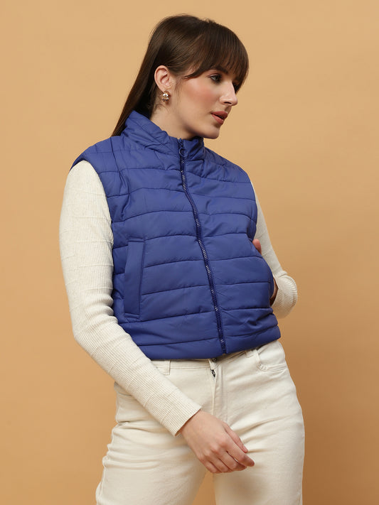 Beatnik Casual Wear Stand Collar Sleeveless Quilting Hip Length Royal Blue Jacket