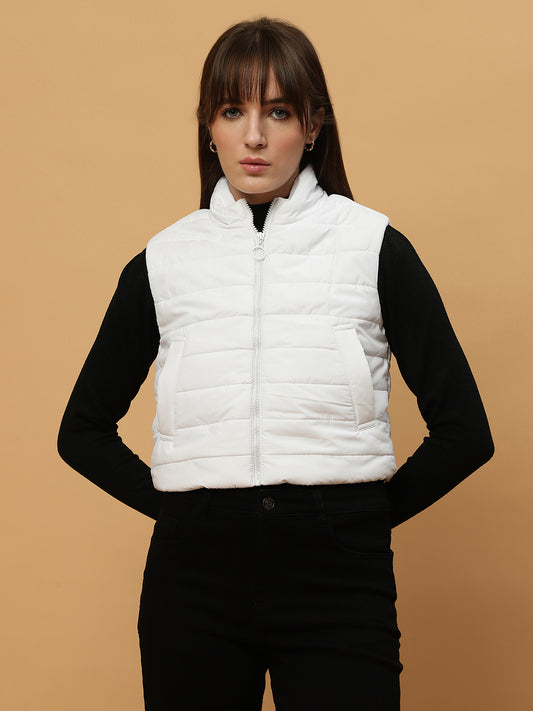 Beatnik Casual Wear Stand Collar Sleeveless Quilting Hip Length White Jacket