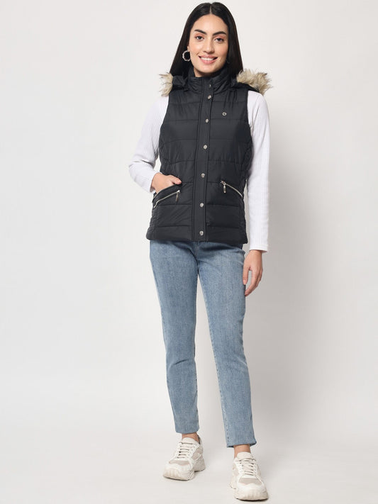 Beatnik Casual Wear Hooded Sleeveless Quilted Black Jacket