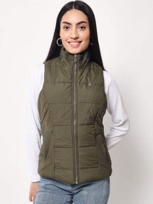 Beatnik Stand Collar Sleevesless Adjuster Olive Green Puffer Jacket