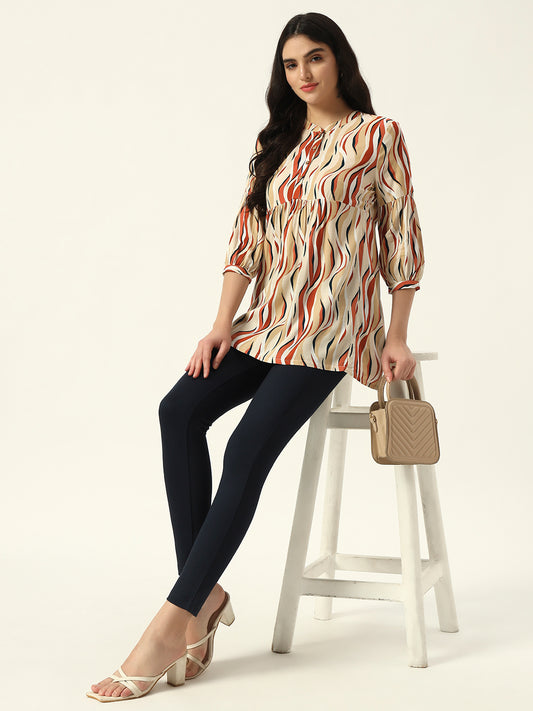 Beatnik Printed Casual Wear 3/4th Sleeve Mandarin Collar Flared Beige Tunic