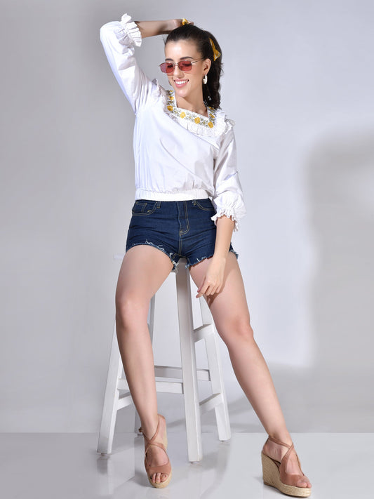 Sky Blue Printed Ruffle Neck Top with Shorts