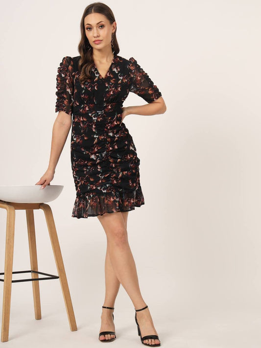 Beatnik Chiffon Fitted Printed Haff Sleeve Black Women Dresses