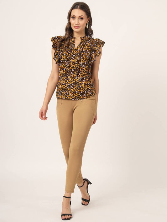 Beatnik Regular Printed Half Sleeve Olive Green Women Top