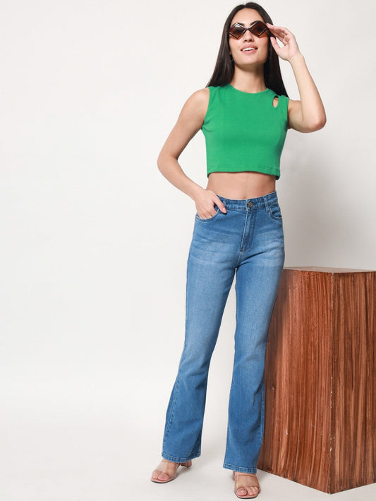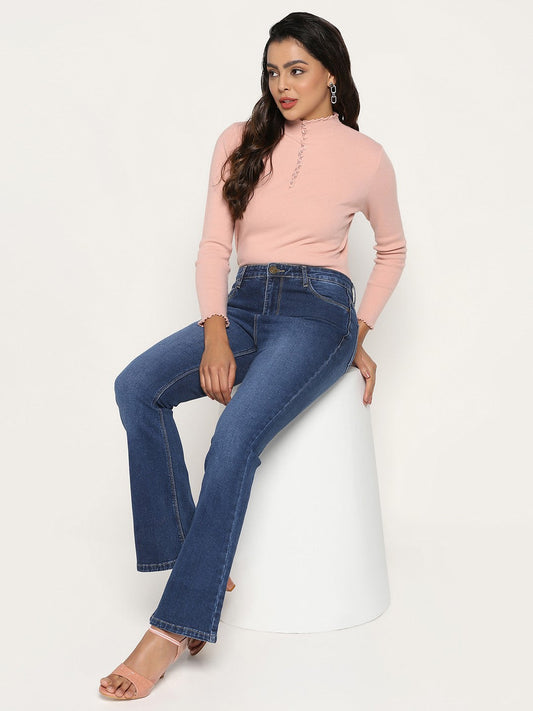 Beatnik Solid Casual Wear Stretchable High-Rise Blue Denim Ankle Length Flared Jeans