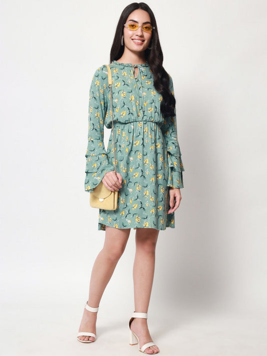 Beatnik Mesh Fitted Printed Shorts Sleeve Green Women Dresses