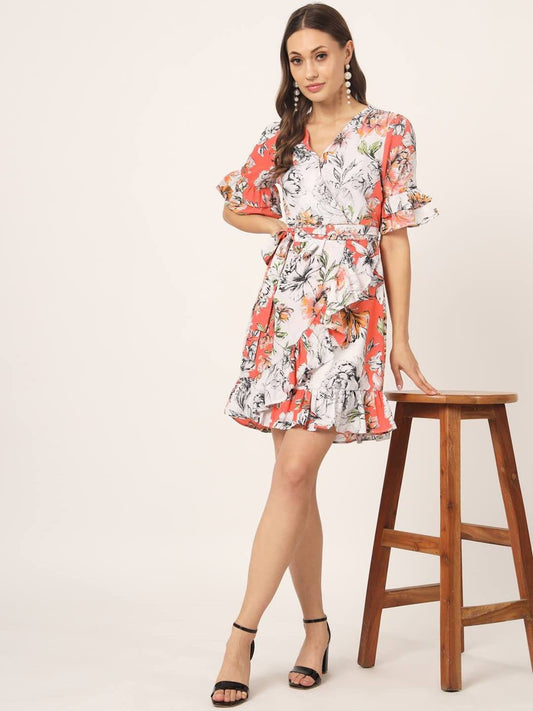 Beatnik Polyester Fitted Printed Shorts Sleeve Red Women Dresses