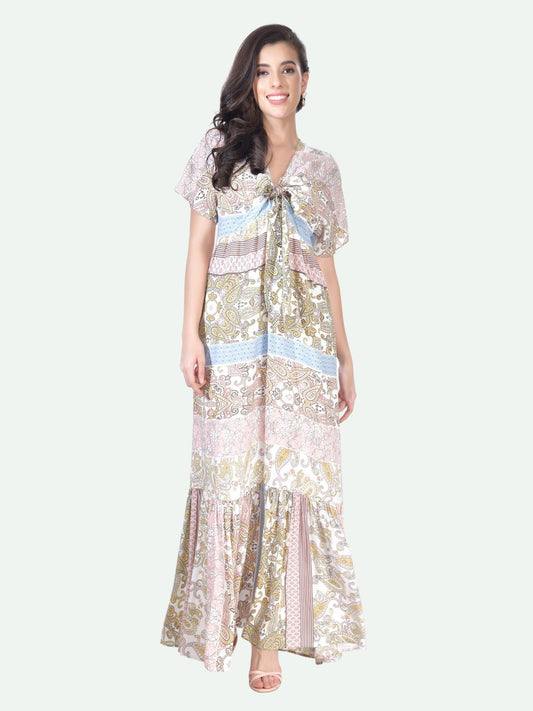 Beatnik Floral Embrace Empire Rayon Midi with Petal Sleeves and Knot Details Dress