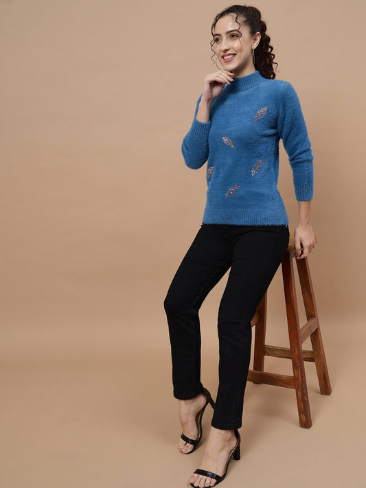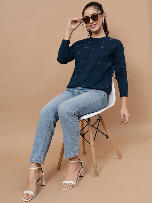 Beatnik Pullover with Rhinestone Teal Blue Sweater