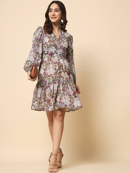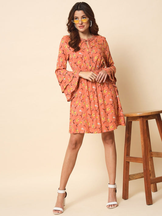 Beatnik Chiffon Slim Fit Printed Full Sleeve Peach Puff Women Dresses