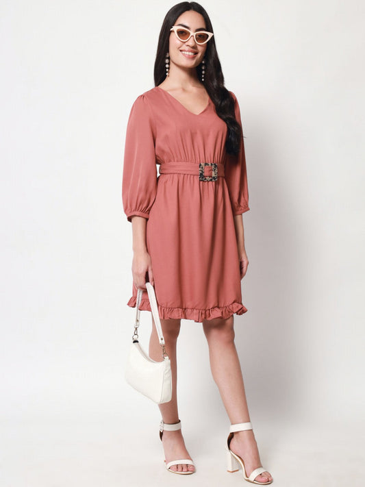 Women's A-Line Mini Maroon Dress with Puff Sleeves and Stylish Buckle Belt
