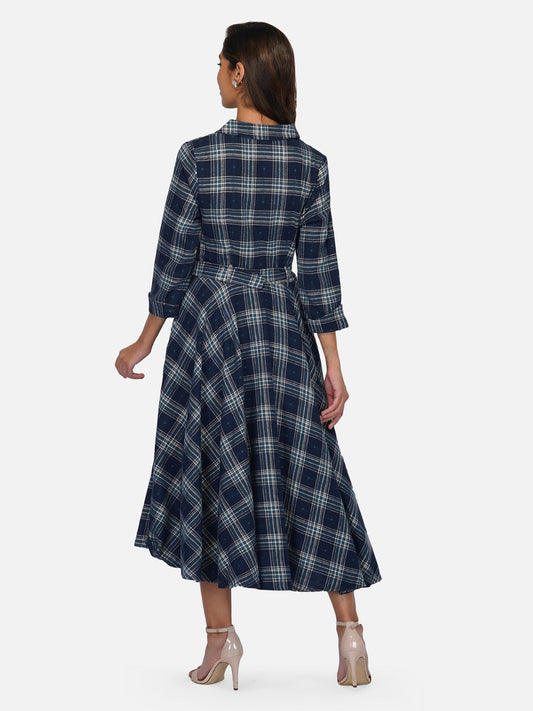 Fitted & Flare Checked Print Casual Wear Blue Midi Dress