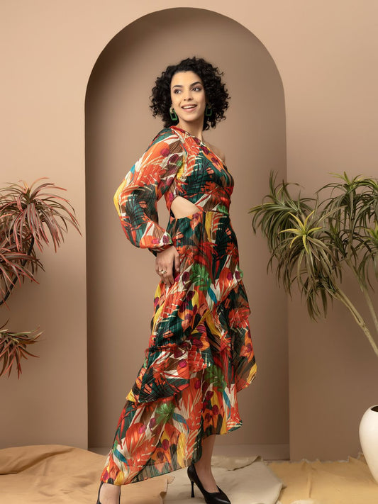 Tropical Print High-Low One Shoulder Maxi Dress in Lurex Satin