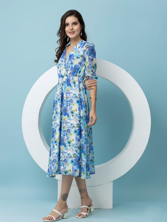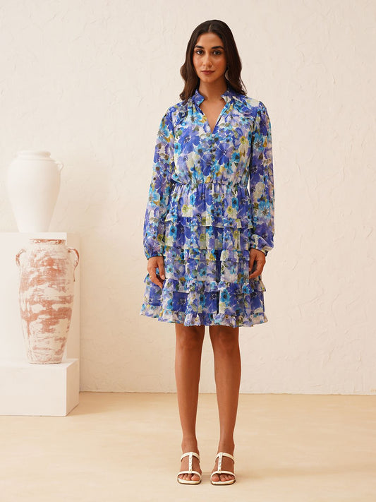 Floral Print Chiffon Bodycon Mini Dress with Layered Sleeves
